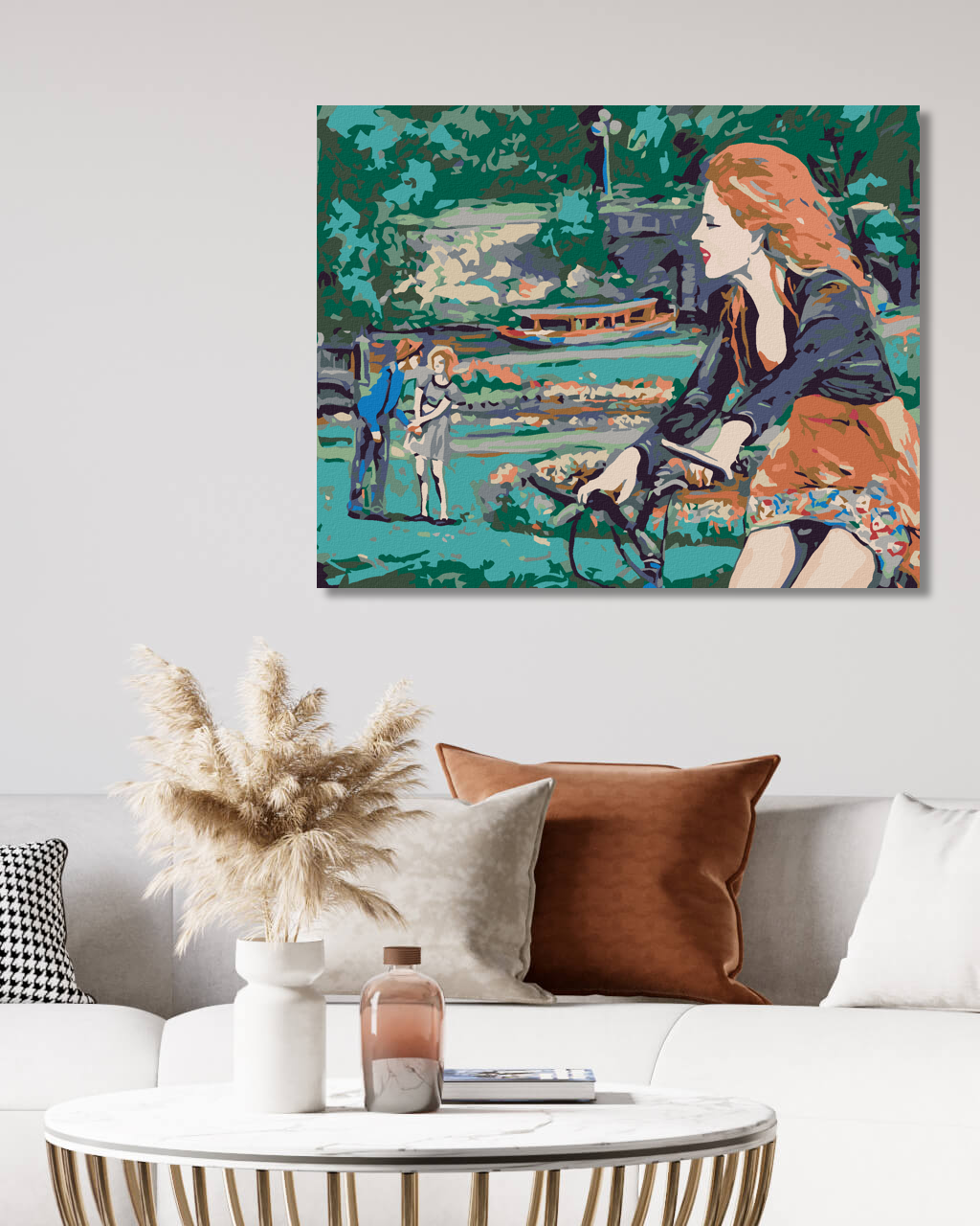 Goblen cu diamante - FEMEIE MERGÂND CU BICICLETA PRIN PARC