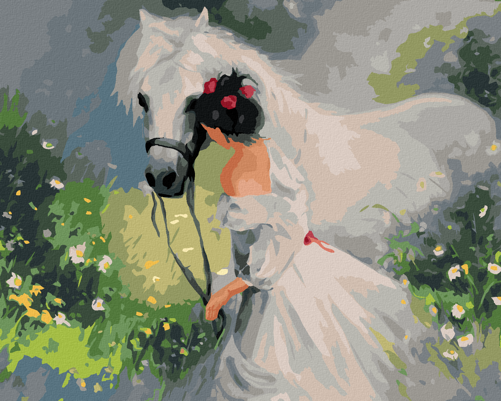 Pictură pe numere - FEMEIE ÎÎN ROCHIE ALBĂ CU UN CAL